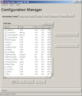 En el applet del Configuration Manager, nos situamos en el tab de Information Fields y creamos los siguientes campos: p_cedula, p_nombre, p_email y p_tipo, con las características siguientes: